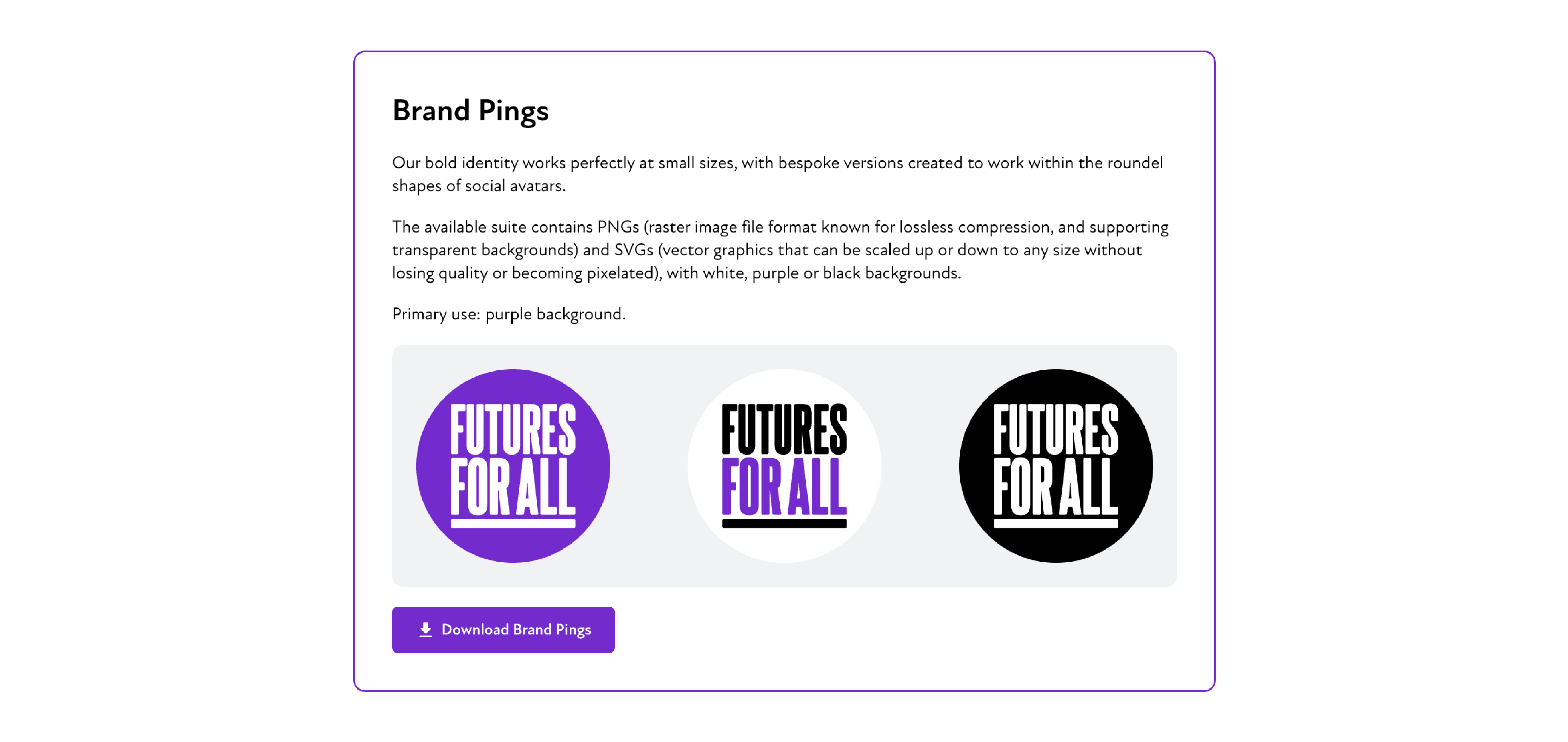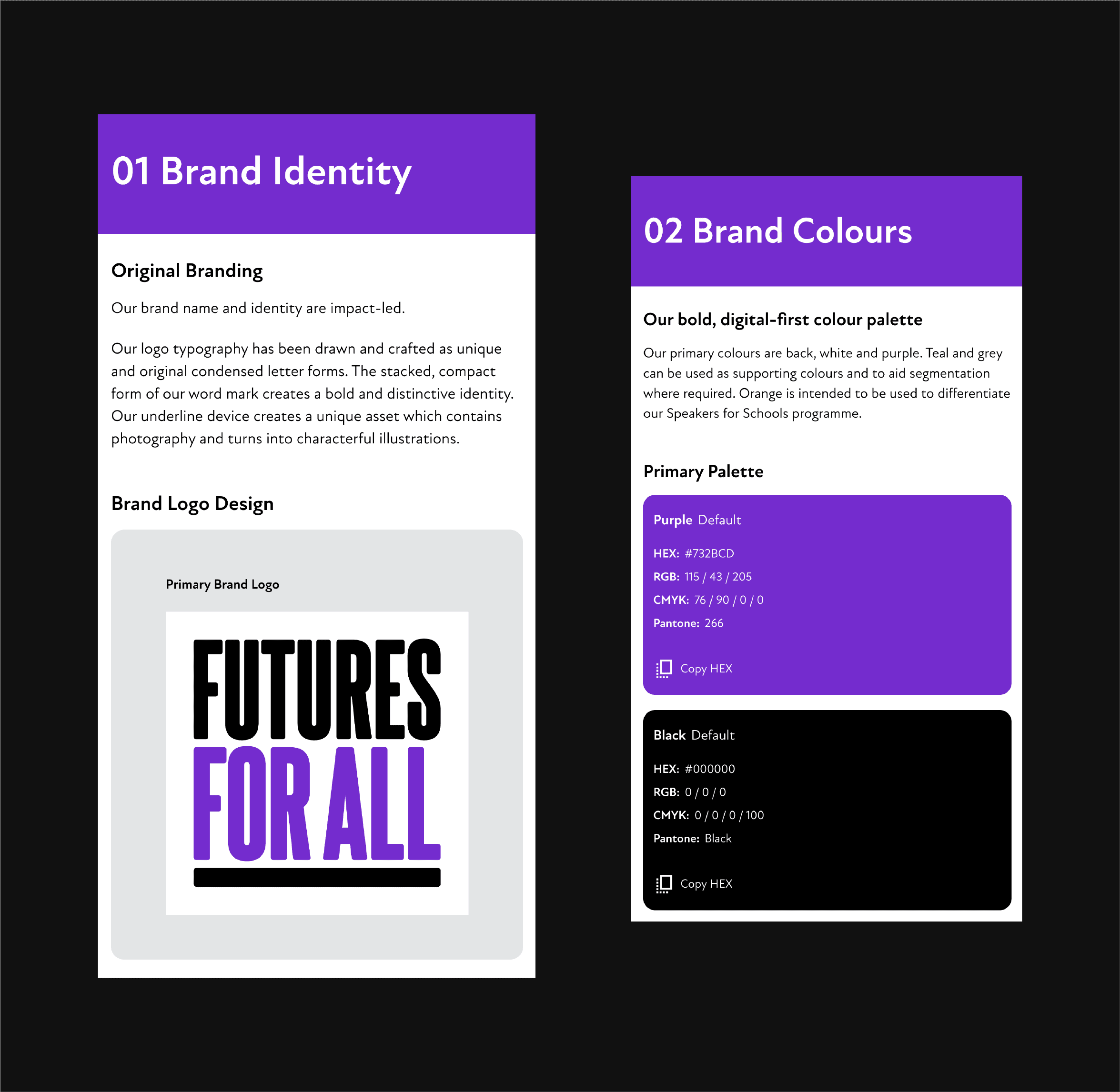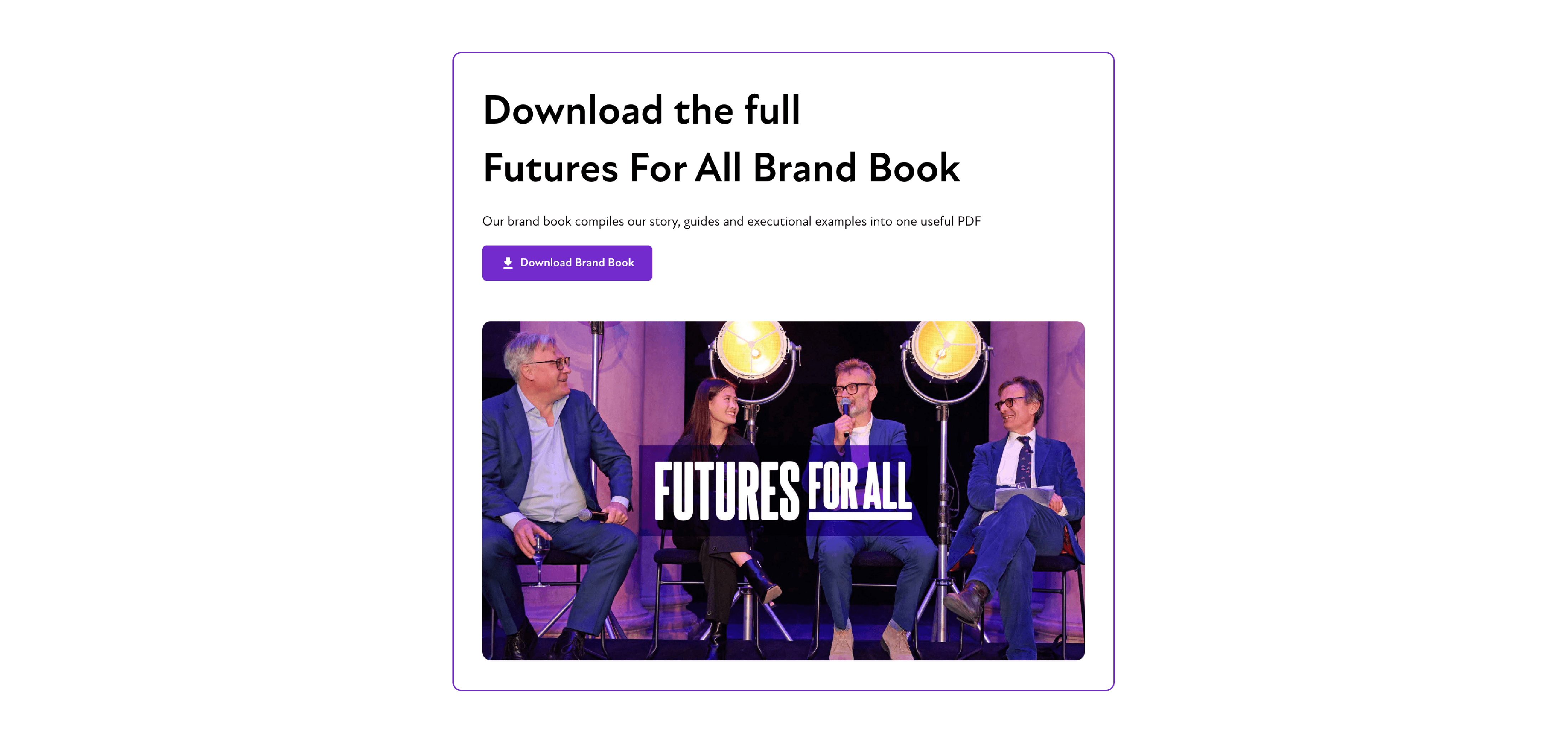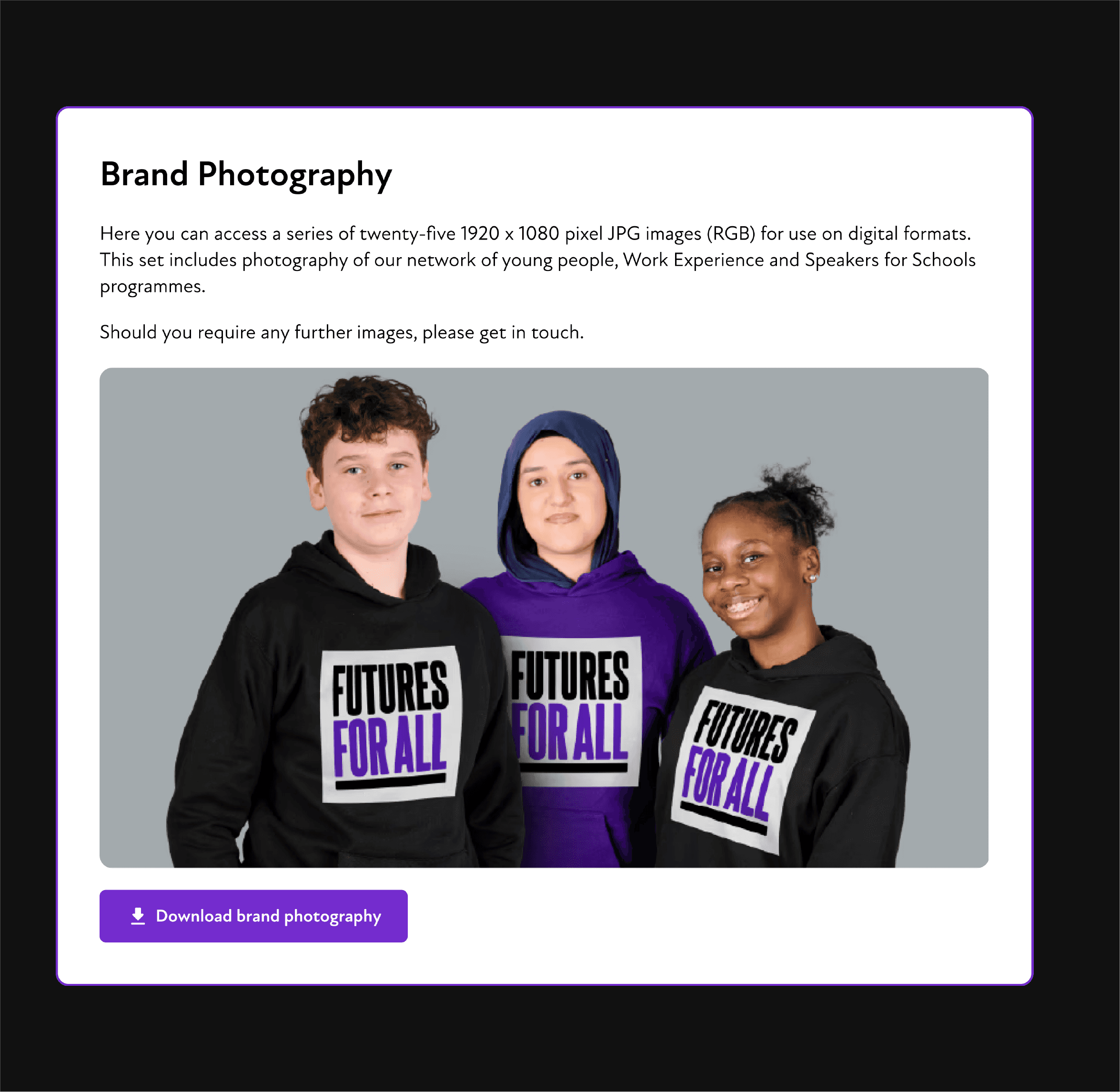 It supports teams in maintaining brand consistency at scale, while enabling partners and supporters to confidently represent Futures For All without additional guidance.